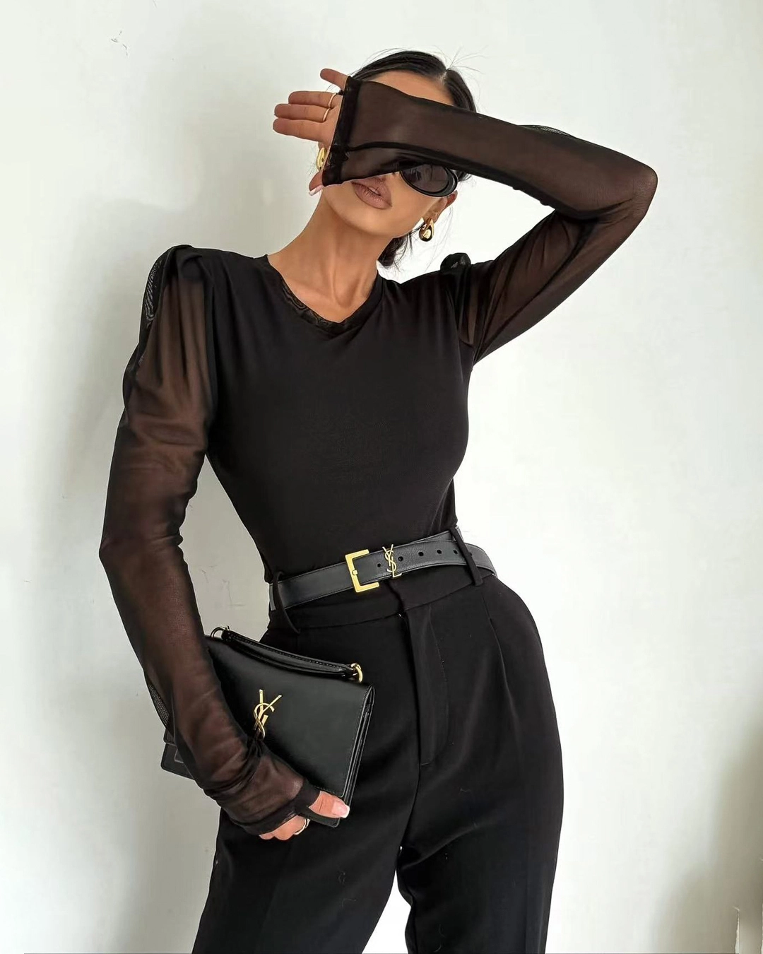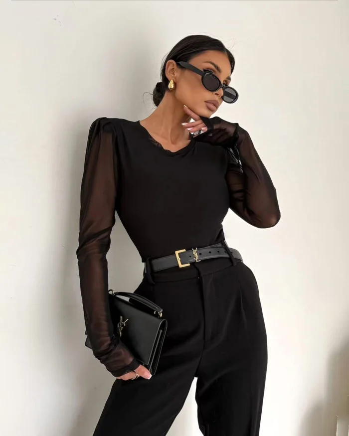Κομψό και μοντέρνο κορμάκι από ελαστικό ύφασμα που εφαρμόζει τέλεια στο σώμα. Τα διάφανα μανίκια προσθέτουν μια διακριτική, σικ και αισθησιακή λεπτομέρεια, ενώ η εφαρμοστή γραμμή εξασφαλίζει άνεση και σταθερότητα. Ιδανικό για βραδινές εξόδους ή για να ολοκληρώσετε ένα στιλάτο outfit με φούστα ή παντελόνι.