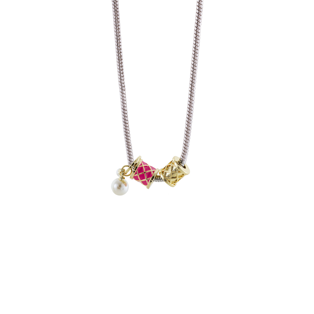 Κολιέ Harlequin μεταλλικό ασημί με επίχρυσα στοιχεία με ροζ σμάλτο και πέρλες