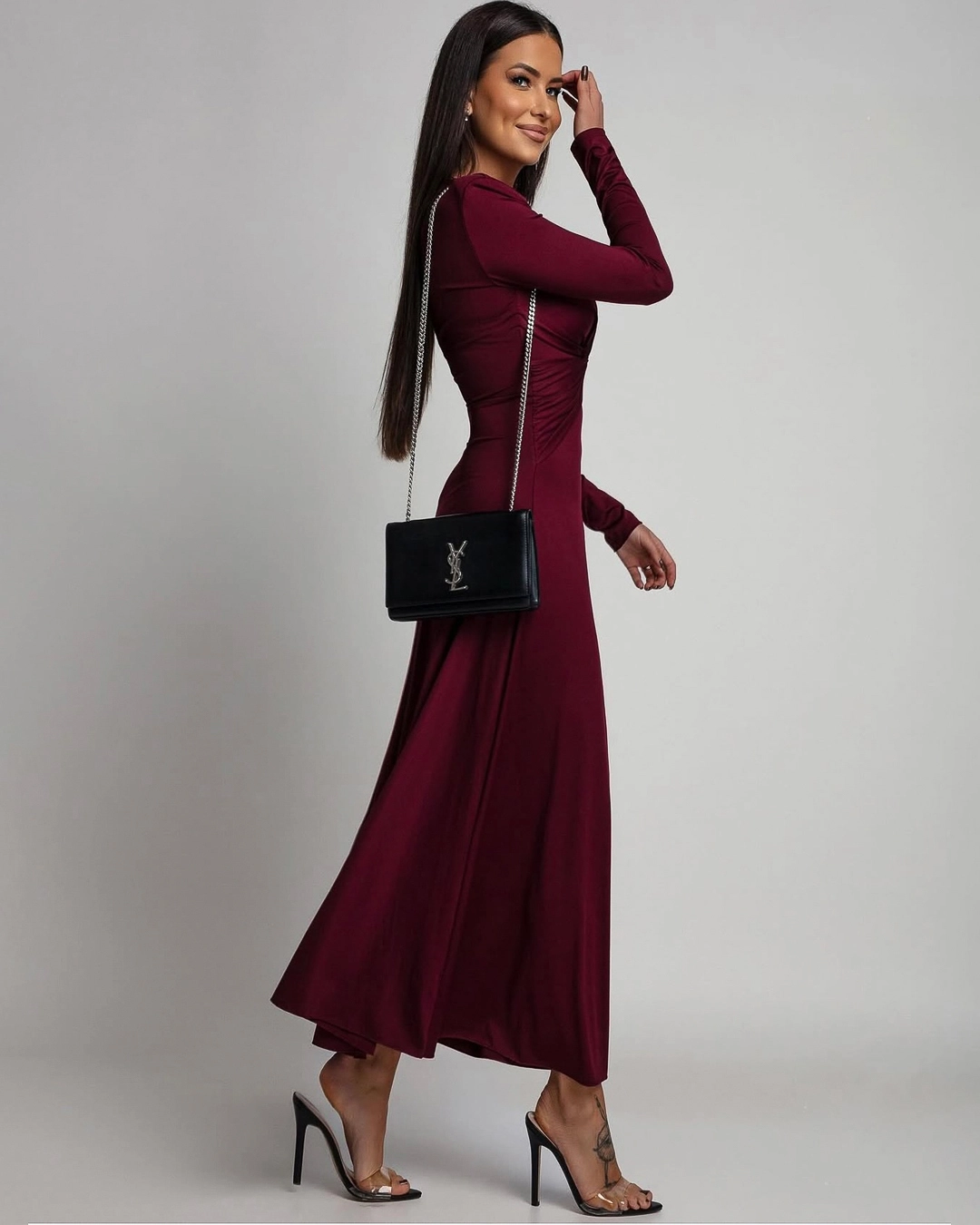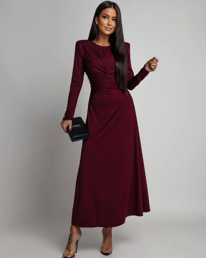 Αποπνέετε κομψότητα και θηλυκότητα με αυτό το μακρύ φόρεμα σε minimal γραμμή. Διαθέτει εντυπωσιακή σούρα που τονίζει τη μέση, μακριά μανίκια και ελαφρώς ανοικτή γραμμή στο κάτω μέρος για άνεση και κίνηση. Ιδανικό για επίσημες εμφανίσεις, γάμους ή βραδινές εξόδους, προσφέροντας ένα διαχρονικό και εκλεπτυσμένο look.