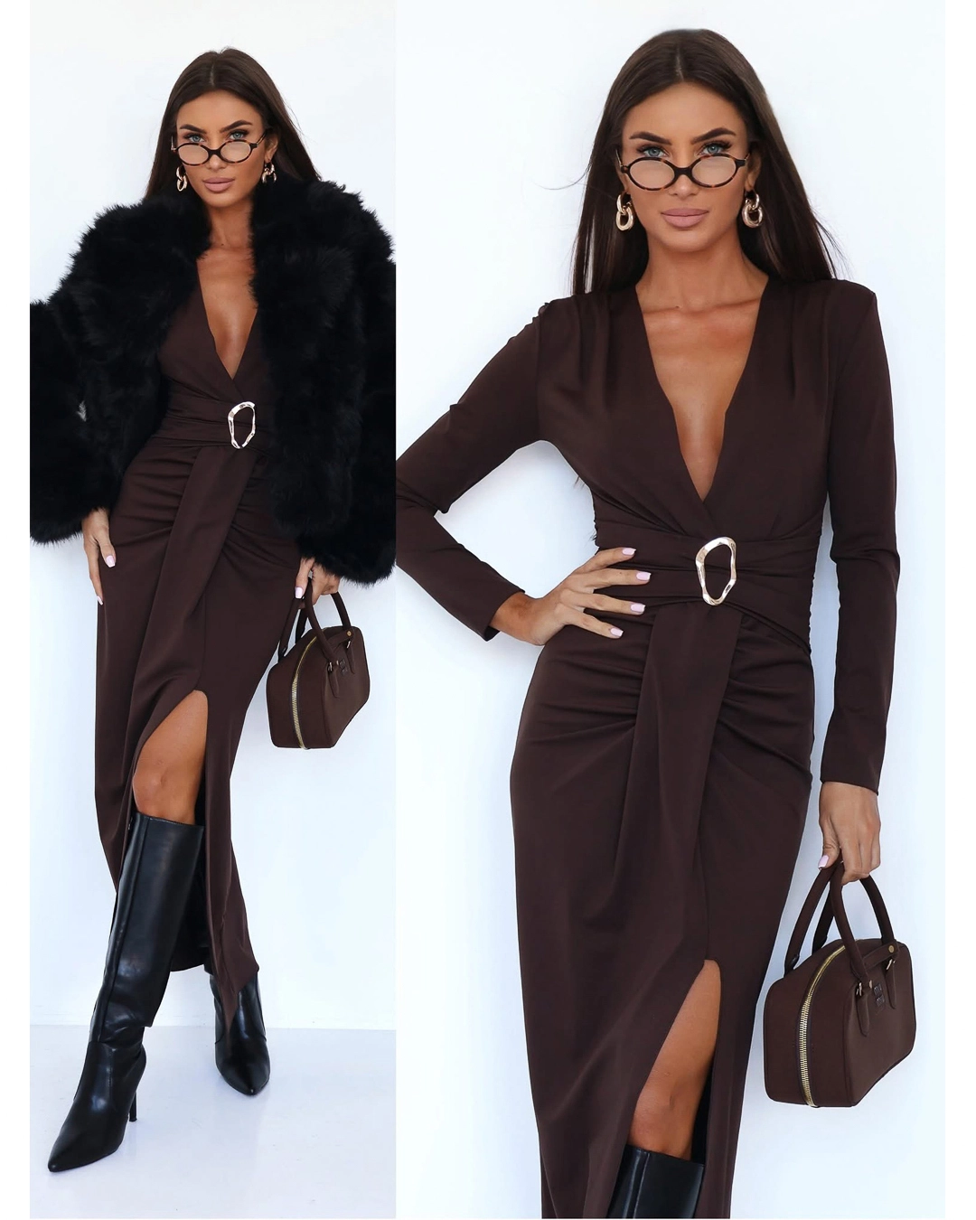 Αναδείξτε τη θηλυκή σας πλευρά με αυτό το εντυπωσιακό μάξι φόρεμα, σχεδιασμένο με V ντεκολτέ και διακοσμητική λεπτομέρεια στη μέση που τονίζει τη σιλουέτα. Το σκίσιμο στο ένα πόδι προσφέρει κομψή κίνηση και διακριτικό αισθησιασμό σε κάθε σας βήμα. Ιδανικό για βραδινές εξόδους, επίσημες εκδηλώσεις ή ξεχωριστές περιστάσεις, προσφέροντας στυλ και άνεση ταυτόχρονα.