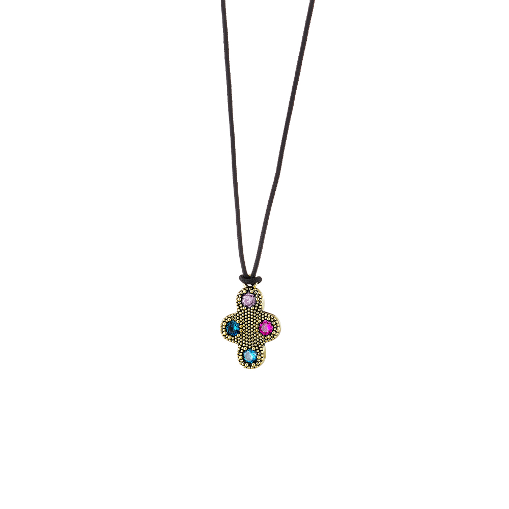 Κολιέ Natrix μαύρο κορδόνι με μεταλλικό επίχρυσο σταυρό και πολύχρωμα ζιργκόν