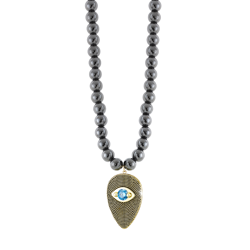 Κολιέ Natrix μεταλλικό επίχρυσο με γκρι σφαίρες, δάκρυ και μπλε μάτι ζιργκόν