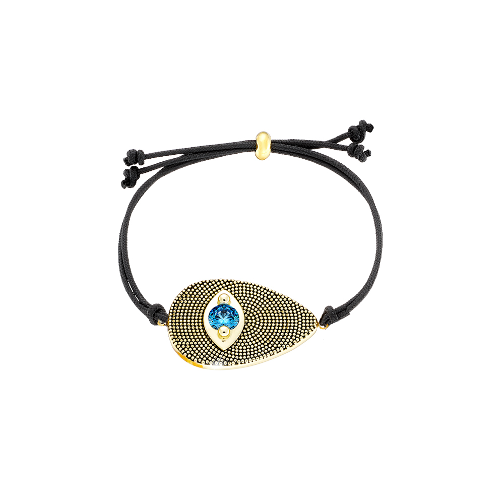 Βραχιόλι Natrix μαύρο κορδόνι με μεταλλικό επίχρυσο δάκρυ και μπλε μάτι ζιργκόν