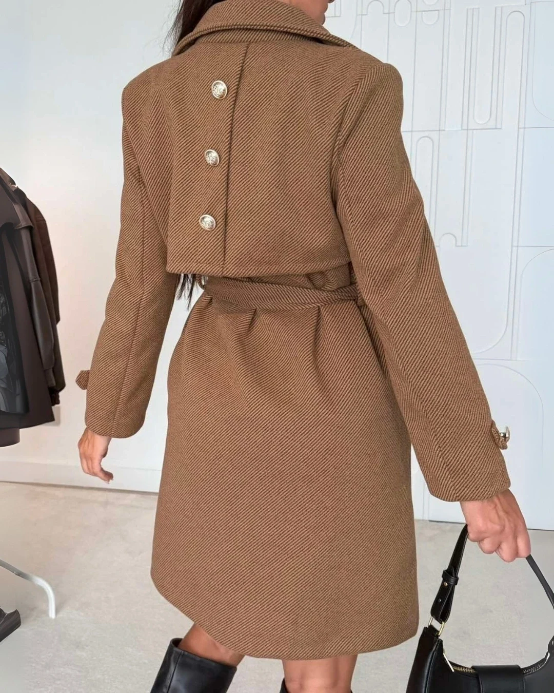 Διαχρονικό παλτό με ζώνη στη μέση που αναδεικνύει τη σιλουέτα και χαρίζει άνετη εφαρμογή. Διαθέτει εσωτερική φόδρα και βάτες για σωστή δομή, πρακτικές εξωτερικές τσέπες και κουμπιά μπροστά. Στην πλάτη ξεχωρίζει με διακοσμητικό κομμάτι υφάσματος και κουμπιά, ενώ τα μανίκια έχουν λουράκια με κουμπάκι για μοντέρνα πινελιά. Ένα κομψό και πρακτικό παλτό που συνδυάζει κλασικό στυλ με μοντέρνο design, ιδανικό για καθημερινές αλλά και πιο επίσημες εμφανίσεις.