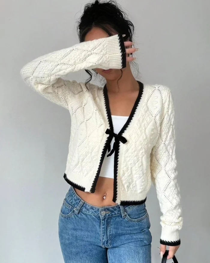 Πλεκτή ζακέτα με ανάγλυφη πλέξη και δέσιμο με κορδέλα