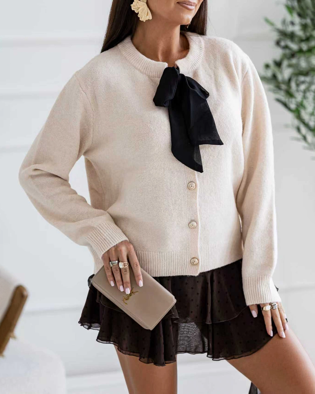 Πλεκτή ζακέτα με κουμπιά και διακοσμητικό φιόγκο