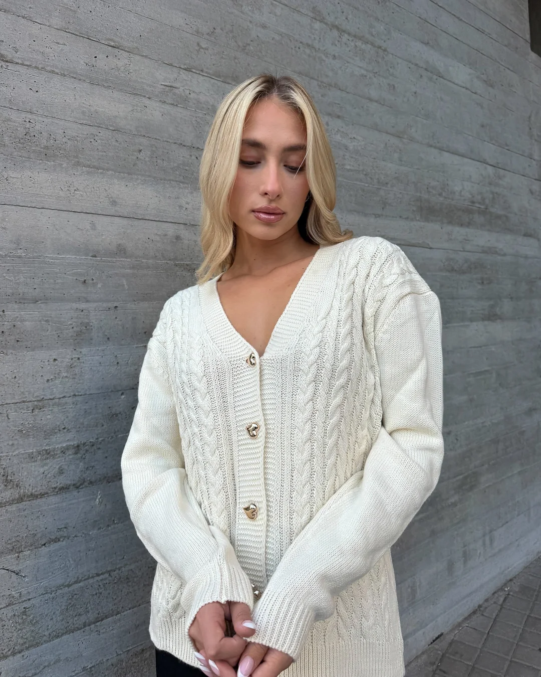 Ανακάλυψε μια ζακέτα που συνδυάζει κλασική κομψότητα με χαριτωμένες λεπτομέρειες. Το πλεκτό σχέδιο με πλεξούδες χαρίζει πλούσια υφή και διαχρονικό ύφος, ενώ τα κουμπιά σε σχήμα καρδιάς προσθέτουν μια ιδιαίτερη, ρομαντική πινελιά που κάνει το κομμάτι να ξεχωρίζει. Η άνετη γραμμή της την καθιστά ιδανική για καθημερινή χρήση, αλλά και για πιο προσεγμένες εμφανίσεις. Φόρεσέ τη πάνω από tops, πουκάμισα ή φορέματα και δημιούργησε chic layered outfits χωρίς προσπάθεια.